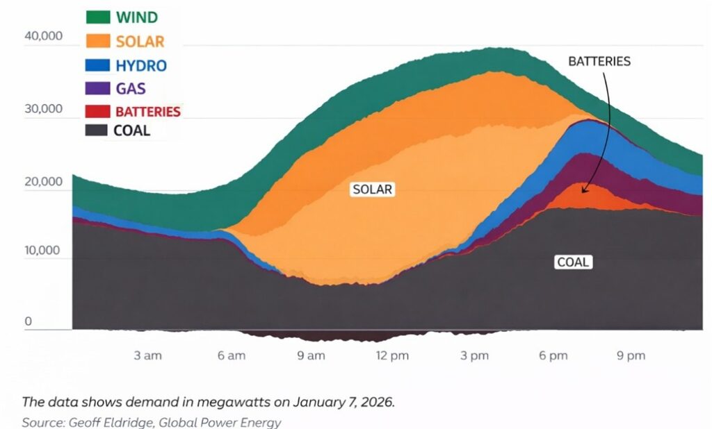 Rooftop solar claimed an annual average fraction of total electricity demand of around 15%, while large-scale solar projects contributed over 7%, for an estimate of 22% of total electricity needs being met by solar over 2025. In Q4-2025, Australia’s main grid reached a record renewable (wind and solar) share of more than 50 per cent as demand for power reached a record high and while electricity prices fell to their lowest value in two years (ABC News).