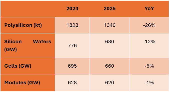 From supply side, according to CPIA (China Photovoltaic Industry Association), in 2025, the total polysilicon output reached 1.3 million-ton, Wafer output reached 680 GW, Cell 660 GW, and module 620 GW, presenting a declined utilization rate.