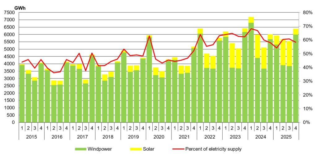 The electricity consumption in 2025 was 40.45 TWh, a 5 % increase compared with 2024. Almost 85% of the electricity was covered by renewable energy, including biogas and sustainable biomass, whereas solar covered 11%. On a national level, the average CO2 emissions of a kWh used was 64 g per used kWh.