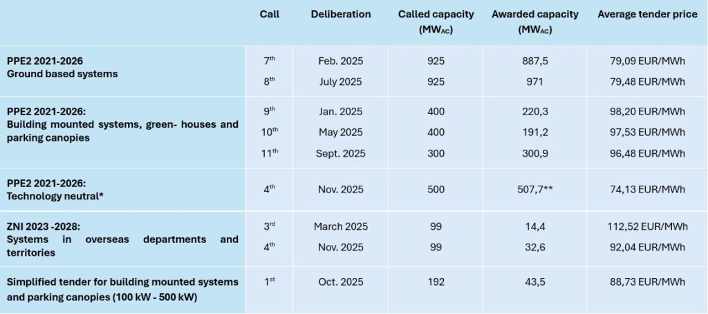 Concerning the residential installations or solar plants on buildings, barns, and parking canopies, with a capacity from 100 kWp to a maximum of 500 kWp, the support mechanisms changed in 2025. The revision of the S21 scheme in March 2025 reviewed eligibility criteria, reduced subsidies, and partially shifted the scheme towards a competitive allocation system. The former Feed-in Tariff support was turned into a simplified Call-for-Tenders system. The first one was held in September 2025, but a significantly lower capacity was allocated as compared to the initially intended one (see table 1). The reform also introduced stricter requirements for projects, including a financial guarantee of €10 000 for each complete connection application for installations over 100 kWp.