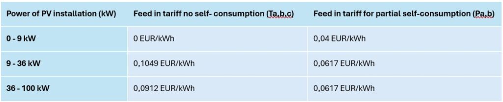 Changes have also impacted the residential installations up to 9 kWp, where the option to sell the whole electricity production to the grid is not allowed anymore. Now, only the injection of surplus electricity into the grid is possible, but with a very low Feed-in Tariff per kWh (see table 2). However, since October 2025, private persons can benefit, under specific conditions, from a reduced VAT rate of 5.5% on the purchase of panels for residential installations. The main condition concerns the carbon footprint of the modules, which must be less than 530 kgCO₂ eq/kWp.