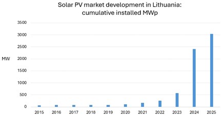 Solar PV has played a key role in this transformation. From virtually zero capacity in 2010 and only 90 MW in 2020, rapid development over the past five years increased installed capacity to 3 040 MW in 2025. This corresponds to 1 053 kW per capita, placing Lithuania among the EU leaders in photovoltaic deployment.