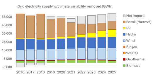 Electricity generation from renewable sources reached around 45 TWh in 2025, corresponding to approximately 75% of gross electricity production (see Fig. 1). Solar PV alone generated about 8.7 TWh, an increase of more than 20% compared to 2024. Solar PV now accounts for roughly one sixth of total electricity generation and close to one fifth of renewable generation.